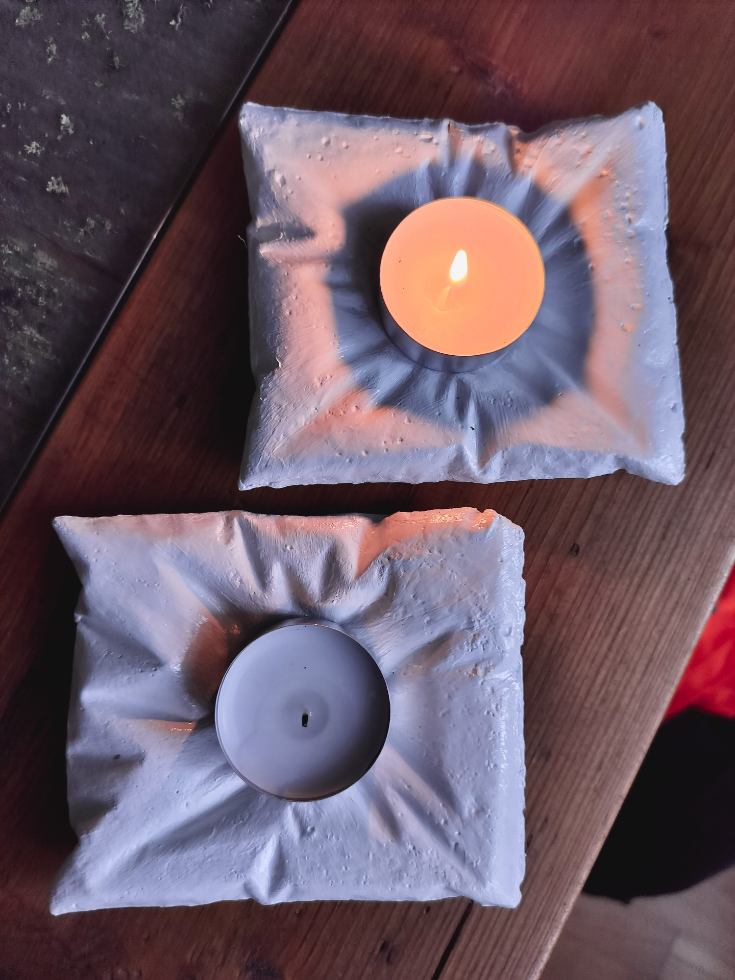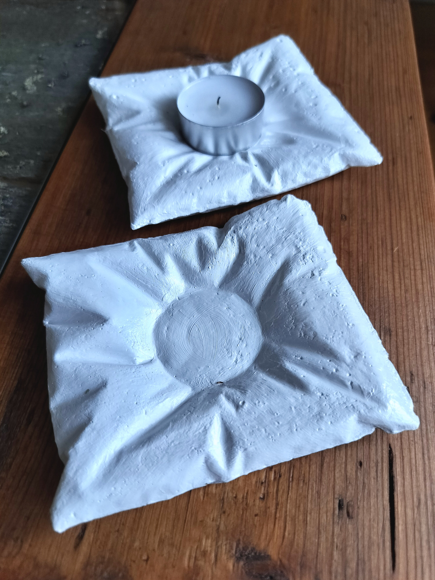 Kaunis käsintehty tuikkukynttilän alusta, valettu askartelubetonista ja maalattu valkoisella akryylimaalilla.